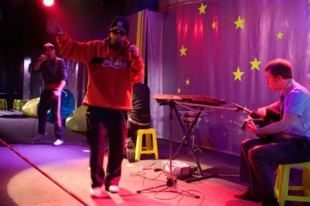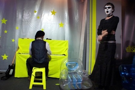 Ir štai į tokį narvą, prigrūstą pripučiamų fotelių, abejotinos kokybės ir patogumo kėdžių, muzikinės aparatūros ir instrumentų, tarp kurių iš tolo akis bado elektrinės spalvos medžiaga apvilktas pianinas, režisierius sumeta dešimt jaunų žmonių. Jų „fasadai“ irgi atitinka aplinką – visko daug, ryšku, marga.