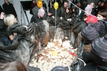 1962-ieji, Viena. Austrų menininkas, Vienos akcionizmo judėjimo atstovas Hermanas Nitschas užsidarė rūsyje su dviem padėjėjais ir nukryžiavo paskerstą ėriuką, tada buvo nukryžiuotas pats ir maudomas gyvulio kraujyje. Šis performansas tapo įvadu į tolimesnes H.Nitscho įkurto Orgijų ir misterijų teatro akcijas, kurių metu buvo skerdžiami buliai, avys, kiaulės, jų kraujas pilamas ant žiūrovų, o vyksmas palydimas bakchanališko dalyvių siautulio, nevaržomo natūralizmo.