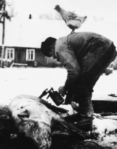 Kruvini pėdsakai baltame sniege (prieš akis iškyla 1982 m. R.Vikšraičio užfiksuotos „Skerstuvės“, sakytumei, simboliškas išlikimo ritualas, tačiau neiškeliantis nei aukos, nei gyvybę atimančiojo) paskatina S.Parulskį suklusti: „Tupėdamas būdelėje suprantu, kad kritinio racionalizmo požiūriu čia nėra jokios mistikos: šiaudų, mėšlo ir purvo sluoksnis, esantis priešais tvartą, vakarykščių skerstuvių metu prisigėrė didelės kiaulės kraujo, iš ryto iškritęs sniegas, veikiamas tėvo svorio, paprasčiausiai nuo to kraujo ir paraudo. Bet kodėl man virpa keliai? Asmeniniai kompleksai ir jų provokuojamų archetipų kerai?“ Lygiai taip ir mums suvirpa rankos, linksta keliai, nenorime matyti to, kas rodoma, priimti tamsios realybės. Lietuviai užsimerkia.
