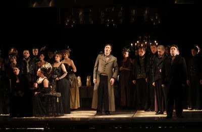 Itališkai dainavęs A. Janutas (Alfredas) buvo jautrus ir švelnus, tačiau gana santūrus, tad šiek tiek liko Violetos šešėlyje. O svečio teisėmis dalyvavęs V. Juozapaitis, puikiai įvaldęs Žermono (Alfredo tėvo) vaidmenį, – konkretus ir įtaigus. Apskritai, visa pagrindinius vaidmenis atlikusi trijulė nusipelnė pagyrų, nes akivaizdu, jog jie spektakliui suteikė daug naujų atspalvių ir padarė jį didingesnį. Beje, tam tikru aspektu jis primena senesnių laikų pastatymus, kai scena būdavo užkraunama daugybe dekoracijų, be to, jos būdavo nuolatos stumdomos ir keičiamos. Tad ir šioje „Traviatoje“ dėl to šiek tiek nukenčia praktiškumas, mat dažnas daiktų nešiojimas kartkartėmis stabdo veiksmą.