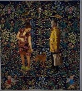 XV-XVI a. tapiserijose vienaragis reprezentuodavo meilužį, mergelė – mylimąją, o medžiotojas – meilės simbolį. Jų ryšį sustiprindavo kontaktas; mergelė dažnai buvo vaizduojama liečianti vienaragio ragą, o medžiotojas - ietimi duriantis vienaragiui į krūtinę. V. Gelūnienės tapiserijoje tarp figūrų nematome fizinio ryšio, nėra susitinkančių žvilgsnių, vienas kito lytėjimo. Susiliejimą galima apčiuopti tik tapiserijos audime panaudotoje milflerų (pranc. mille-fleurs – tūkstantis gėlių) stilistikoje: gėlių raštai dominuoja ne vien kūrinio fone, jie matomi ir ant moters suknelės, o vyro penio vietą išryškina atskiros dėmės, primenančios rudenį krintančius lapus. Remiantis S. Freudu, gėlių žiedai žymi moters genitalijas, todėl tapiserijos fone dominuoja moters seksualinė energija.