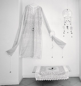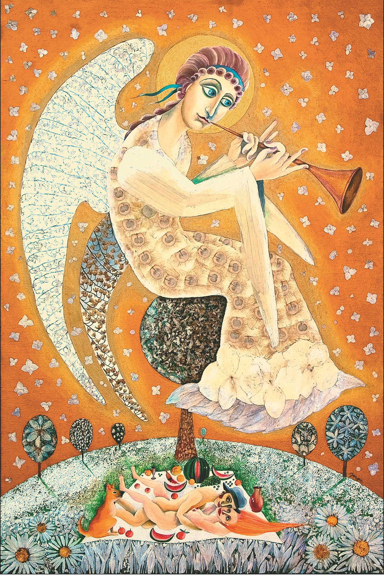 Savo močiutės Helenos Nastopkaitės (Korsakienės) gimtadienio proga Jurga Ivanauskaitė sukuria paveikslą tokiu siužetu. Maža mergytė balta suknele pasipuošusi stovi ant liepto ežero fone, rankose laiko didžiulę puokštę oranžinių lelijų, jau subrendusių aguonų, violetinės raganės. Puokštėje matome du veidus: moters ir vyro. Paveikslo apačioje skaitome labai smulkų kaligrafišką įrašą: „p.s. Mergaitė Helena su mama Elena ir tėčiu Petru švenčia gimtadienį prie Biržų ežero, kuriame jau nužydėjo lelijos ir irstos valtimi du balti angelai.“