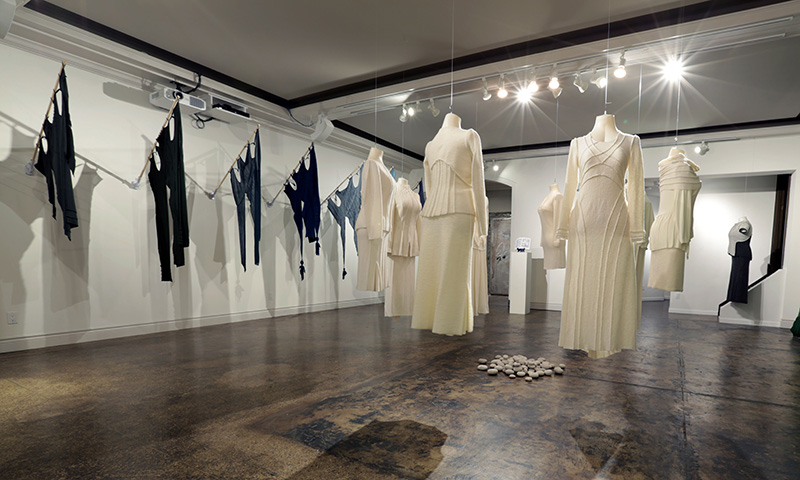 Galerijos salėje taip pat demonstruojami dėvėjimui skirti autoriniai lininiai ir vilnoniai kostiumai. Jie eksponuojami taip, tarsi primintų namų aplinką ir būvį šeimoje – poilsio kambarį ar miegojimo patalpą, kuriai būtina šviesi, saugi atmosfera. Vieni aprėdai lyg vėliavos kabo erdvėje, kiti sukabinti ant pakabų ar numesti ant kėdžių. Pastarieji labiausiai asocijuojasi su mūsų realiu gyvenimu, buitimi, kuomet grįžę namo ir nusiėmę rūbą dažniausiai jį paprasčiausiai paliekame užmestą ant kėdės atkaltės ar kabiname į spintą.