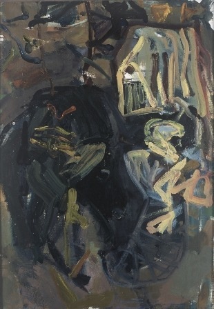 He created a work “Old Couple. Improvisation on the Theme of Old Clothes” in the summer of 1997. The painting has strange colours, deep rich shades of grey and black. Free strokes contrast with yellowish touches of the brush – a running figure on the right side of the painting in an interesting manner. Looking closer at the canvas, one may see a massive black figure covering the running and moving light form. Two forms-figures are like the Chinese yin and yang, the composition of the painting is indissoluble, it is a closed circle. It is the life of Arūnas grandparents who lived in marriage for more than fifty years; and the clothes left by them. Such patient union of two people was a value for Arūnas, which he expressed by the plastic of painting.