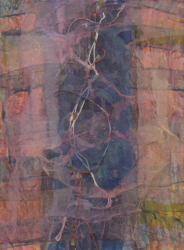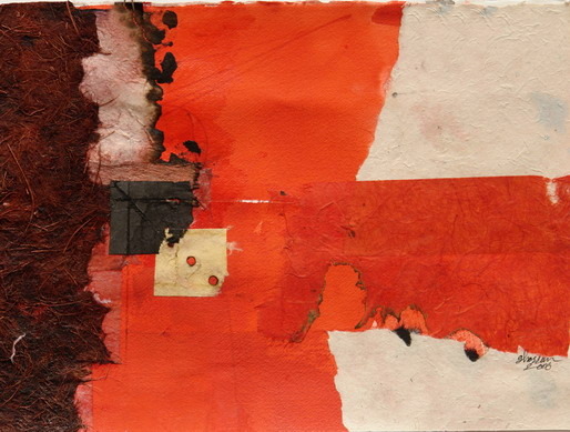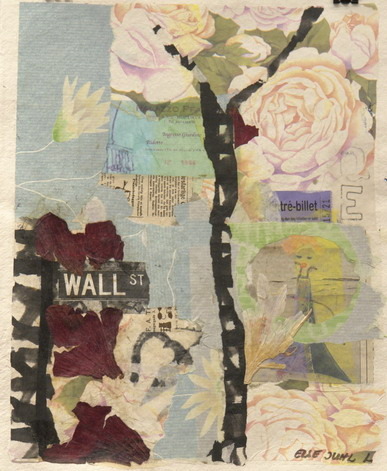 The majority of collages limit themselves with aesthetical values, they attempt to charm with abstract compositions, play of colours, they appeal to emotions rather than intellect. Only several authors succeed to stand out from the droning colourfulness of collages. In addition to industrial fragments artists use organic materials, object trouvé – found things from personal or historical space. They decorate collages with flower blossoms turning the works into sentimental herbariums (Else Juhl Lundhus, Denmark), fragments of cardboard boxes – a note about fragile parcels (Kęstutis Vasiliūnas), with old photographs, clocks, extracts from a note book which denote the past and lost time (Rimvydas Kepežinskas).
