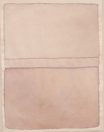 There are some works of a more distant space in which more recognisable images of the horizon are pictured – the beach, motifs of waves. Despite this, it is hard to call these watercolours landscapes not only due to the single-plan and flat perspective and minimal artistic language. It seems that the aim of the author is to render the depth of existence that is hidden behind elements of nature.