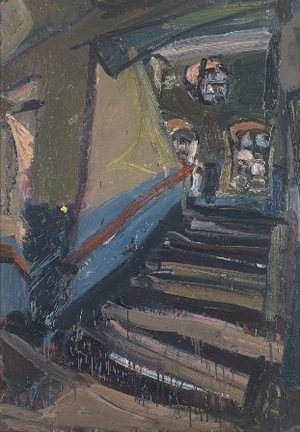 “Interior” painted in the workshop in 1992 is of 192x130 cm. Even though the canvas is abstract, with wild expression of colours, the primary motif which encouraged to create the painting has remained in it – it is so typical of Arūnas. Black stairs going nowhere rise in the flashes of red, blue and yellow colour.