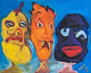 The paintings of Č.Lukenskas are strong by the grotesque, ironic and non-depressing plots and the harsh, sketch-like and consciously primitive manner of painting that derives from the mix of vital energy of the artist and intellectual aggression.