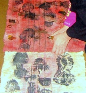 Therefore, traditional techniques prevailed in the residency programme – Japanese created from special paper and old newspapers, Lithuanians used hand-made paper, sewed, weaved, embroidered. S.Inčirauskaitė-Kriaunevičienė and Agnietė Janušaitė-Vitkūnienė decided to refuse embroidery and created their work “Flower Portrait” from holes of different sizes drilled by a drill on the wall of the Picture Gallery.