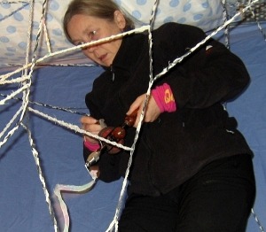 Norwegian Anne Stabel wove a net by stranding pieces of bedclothes by a special device.