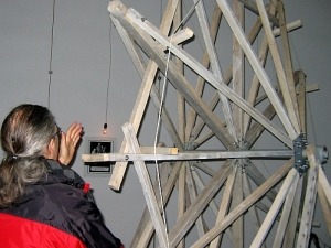 Birgitta Nordström teaches a visitor to make a net.