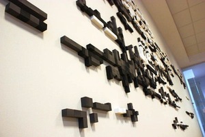 In brief: The site-specific installation ‘Clouds over Kaunas’ by Patricija Gilytė was presented at Kaunas Kolping College in September. The artist arranged pieces of foam in order to convey a real and imaginary map of Kaunas city: ‘In this work I combine architectural forms of the Old Town and the suburbia, silhouettes of trees and houses, a linear similarity of rivers and streets into a multi-stage plain. Trying to decipher it as a subjective map is every time different depending on the perspective of a viewer.’