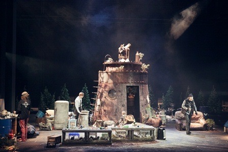 In brief: The director Rolandas Atkočiūnas mixed all kinds of realism and tried to add some magic in his eccentric tragicomedy “Jerusalem”. The cooperation with the set designer Martins Vilkarsis, the director’s conception, all 613 wishes and 7 desires turned into the salad in the performance. It seems sometimes that the viewer needs a voodoo and “miraculous” mushrooms to tune into the performance and to be lead to the general conception.