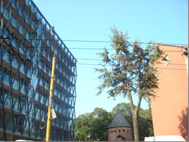 The most painful example is the construction of the high-rise building on the corner of I.Kantas and Kęstutis streets meanwhile. Two facades of the glass building seem to be covered by a huge sock of iron net while the third mirror façade is directed at Millers’ Towner nearby. The environment is too tight for such a building; therefore, it is hardly justifiable in the New Town. The creative language of the architect Gintautas Natkevičius surpasses time and receives compliments of specialists in many cases. Still, the latter example of his work may not be praised by specialists for the neglected scale of the quarter and its premises. The building became an opposite to Kaunas Central Post Office, Musical Theatre and other objects.