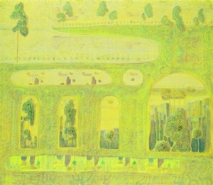 The most typical example is the painting “Sonata I Allegro” (1909). It is visible how M.K.Čiurlionis forced for “abstract style”. Secession lines are typical of other sonatas of M.K.Čiurlionis too.