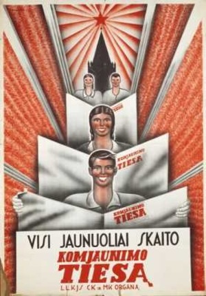 Vytautas Kasiulis. Advertisement poster of the newspaper Komjaunimo Tiesa (Truth of the Communist Union of Youth). 1941, Lithuanian National Museum.