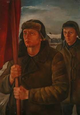 Naturalistic and at the same time surrealistic portraits of Lenin and Stalin painted by Vilnius artist of Karaite origin Bari Egiz are showcased in the exhibition. The faces are painted accurately, while the clothes seem to hand strangely as if there was no body underneath. The portraits of B. Egiz are most probably the only works in the exhibition that correspond to the dogmas of socialistic realism. Canvases of Leonardas Kazokas, Marija Cvirkienė, Vladas Jankauskas on the theme of work reflect the continued earlier tradition of painting. There are not many works from the period of 1940-1941 in museum funds. According to the exhibition curator, the most expressive examples of socialistic realism were destroyed by hands of authors themselves as soon as the noise of German motorbikes was heard in Kaunas streets.