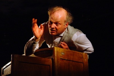 The mono-performance of the Hungarian actor Pйter Scherer “Klamm’s War“ according to the play of Kai Hensel was awarded with the first prize in the festival. The performance staged by the director Jána Novák also became the favourite of the audience. The actor P.Scherer undertook the complicated role of a teacher. The spectators of “Klamm’s War“ become pupils, the silent enemies of the teacher. The neurotic and sarcastic character acted by P.Scherer reveals the closet of his soul full of fears, hatred, contempt and desperation. The lesson is a complicated psychological polyphony formed of sarcasm, philosophy, comic and grotesque moments.