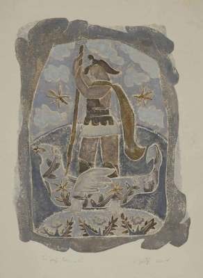The cycle on Lithuanian folklore themes may be attributed to the monotype technique. These are hand-painted embossing clichés. The print is the only and cannot be repeated. These graphic works stand out by complicated but integral scale of muted colours. In the opinion of the artist Ričardas Povilas Vaitiekūnas these works surpass the limits of graphic art and reach the persuasiveness of colour painting.