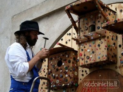 The aforementioned Kėdainiai inhabitant has already covered several buildings of the town by his creative works: last year he decorated the facades of untidy buildings of Kėdainiai old town, in the place of which Scottish houses of the 17th and 18th century were located earlier, by buttons and nesting-boxes.