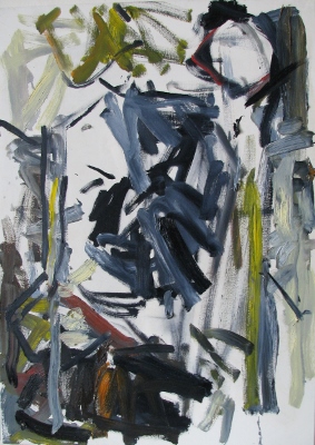 Bet nejučiomis, einant nuo vieno paveikslo prie kito, matant, kaip kinta spalvos, formos, vienos išnyksta, kitos atsiranda, norisi pasakyti, kad tapytojos grindys – tai pati tiksliausia detalė šiai vietai įprasminti. Štai pirmieji darbai – tai pradžios ženklai, iš jų šviesaus, vietomis balto drobės grunto ir švelnios lasiruotės rutuliojasi kiti, su tamsėlesniais atspalviais. Toliau darbuose, viršutiniame sluoksnyje, atsiranda grafiška juodų tonų gausa, kuri bando savaip įrėminti daugiakampes (kai kur daugiabriaunes) formas, tolimesnėse drobėse pamažu daugėja aliejinių dažų, jų potėpiai intensyvėja, o paskutinieji darbai gerte prisigėrę dažų, matyti net jų perviršis – sukietėję dažų  gumulėliai savo ryškumu ir aštrumu nori „įskaudinti“ akis. Ir galiausiai paskutinis paveikslas – prie medžio prikalta drobė, paskendusi tamsybėse (šis darbas eksponuotas atskirai, ant laiptų, todėl  tamsumos turi ir tiesioginę reikšmę), bet su paliktais baltais kraštais tyčia apnuogintoms vinims. Ir kaip čia neprisiminus heidegeriško meno kūrinio reikmens suvokimo ir jo paaiškinimo.