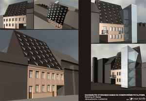 Numatoma išlaikyti autentišką pagrindinį dviejų aukštų pastato fasadą ir praėjimą į kiemą. Vidaus kiemo pusėje esančią sieną irgi siūloma palikti, minimaliai keičiant angų vietas, jas pritaikant prie naujojo suplanavimo. Išlaikomi ir pritaikomi esami balkonai. Stogo konstrukcija dvišlaitė su papildomu nuolydžiu nuo pastato Nr. 29 link pastato Nr. 25. Siekiama sumažinti stogo aukščių atotrūkį, nes namas Nr. 25 yra dviejų aukštų, o Nr .29 keturių. Visa stogo plokštuma su įžambiomis vertikaliomis išėmomis, kurių šoninėse plokštumose įrengiami langai. Stogas tokiu būdu atrodo banguojantis. Nuo Birštono gatvės tarsi padengtas tik skarda, o nuo Karaliaus Mindaugo prospekto pusės daugiau matyti stiklinė stogo konstrukcija. Vidaus suplanavimas būtų derinamas prie palėpės plotų ir konfigūracijos. Pagrindinė laiptinė projektuojama vidaus kieme ir glaudžiama prie buvusios laiptinės vietos. Laiptinės išorės apdaila – struktūrinis stiklinimas.