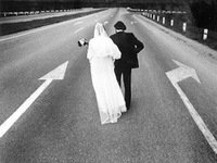 Eina jaunavedžiai. Jiems kelio ženklai rodo dvi rodykles į skirtinga puses. Tai garsi Jono DANIŪNO fotografija, spausdinama šalies ir užsienio prestižiniuose fotomeno leidiniuose, tiksliai simbolizuojanti Jono ilgametę kūrybą.